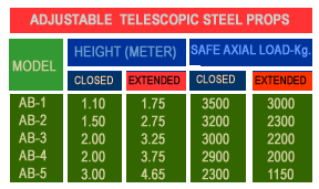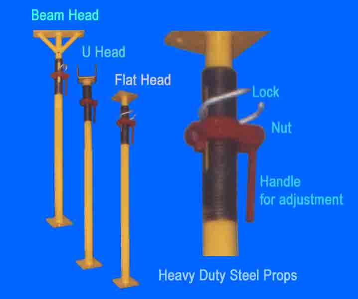 Normal Sizes of Props Telescopic props are used as supportunder the beams and are availablewith Flat Square Head, U Head, Beam Head and Align Head. Outer Tube is60.2 MM O.D. and Inner Tube is 48.3 MM O.D. with the specification mentioned below. |
